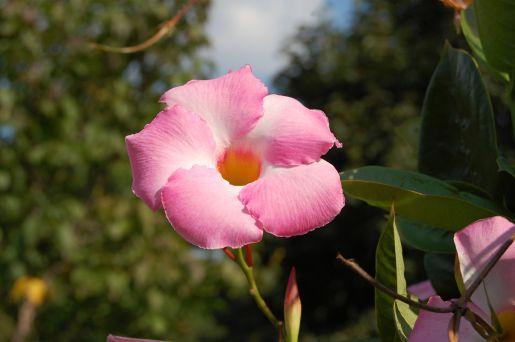 Close-up of a mandevilla bloom. Potted tropicals are placed outdoors in the summer and brought in for the winter.