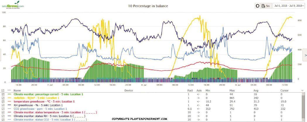 climate monitor. This monitor reveals, at a glance, whether all climate factors concerning the assimilates are well-balanced or not in 5-minutes intervals. This module allows the grower to program his personal optimal strategy for temperature, humidity and CO2 in response to the actual radiation level in the greenhouse. The green bars indicate to what extent the realised climate conditions are optimal. The module provides additional graphs to analyse the minimum factor(s) (PAR, CO2, RH, irrigation) as well.