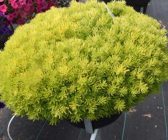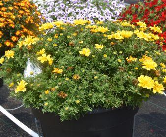 Bracteantha Mohave Yellow (6) was one of the most resilient plants in the trials, but growers had a bad experience with growing Bracteantha due to downy mildew on the old varieties, which has been corrected with new breeding. Growers also used to put three cuttings in a 10” pot or hanging basket where it tends to split. The solution is easy – just use one cutting per pot, which is more economical, and you will get a full pot with flowers that hardly need to be deadheaded. Plus, the rain, wind, and hot or cool weather make it look great.