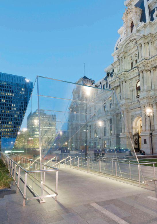 92 lites of 5-ply and 7-ply laminated, oversized, structural glass that protects access to public transit without any metal structure supporting the roof.