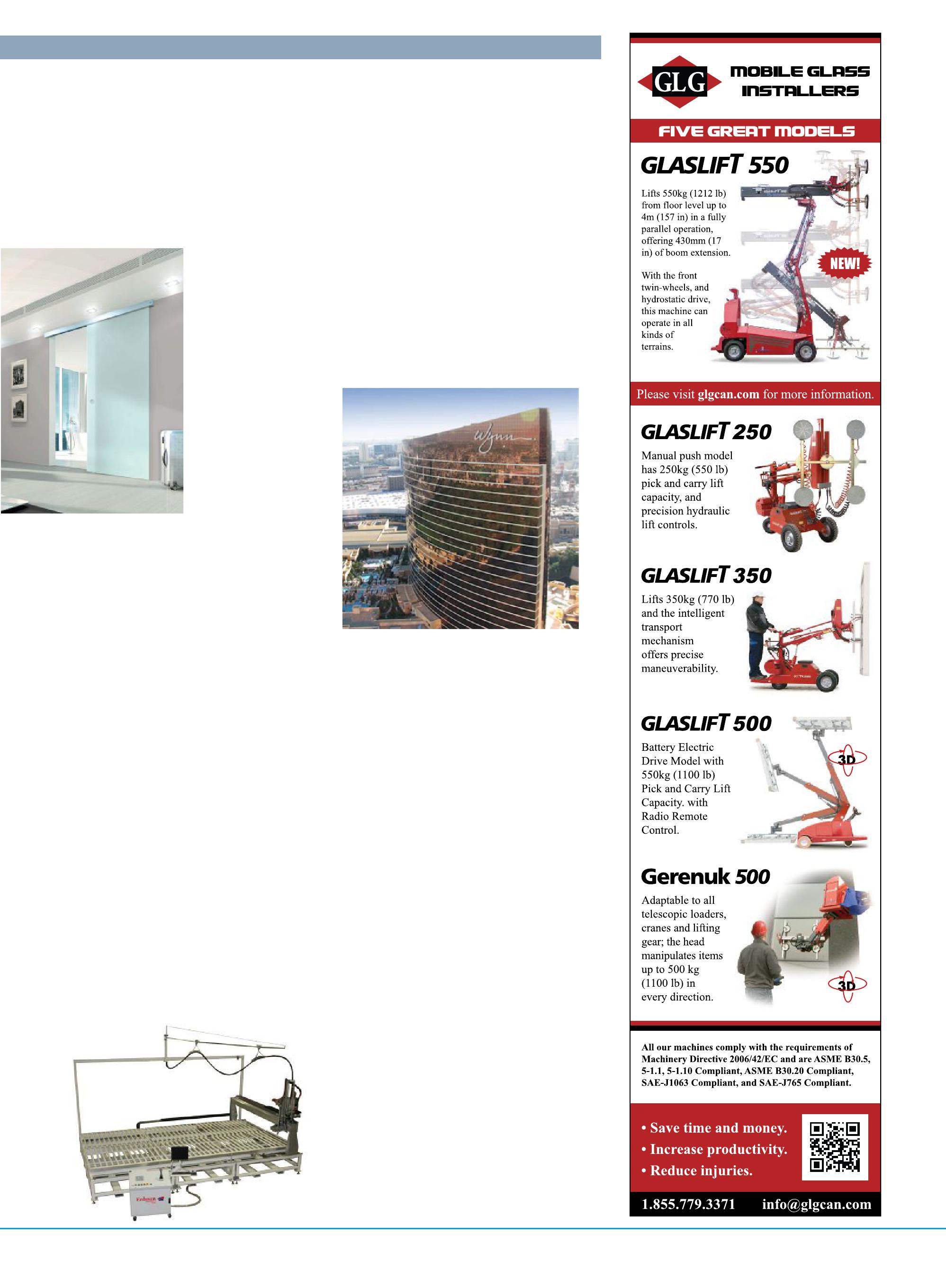 Additional features include stainless steel hardware, foamfilled no-flat tires and side shift control. The GL250D is the base model, which is a manual push mobile glass handler capable of picking, transporting and precision placement of 550 pounds. The GL350 is a self-propelled, battery electricdrive mobile glass handler capable of picking, transporting and precision placement of 770 pounds. The GL250/GL350 front lift frame is designed to lift loads straight up or down with lift geometry similar to a fork lift. The GL550 features a self-propelled, battery electric hydrostatic drive for rough terrain mobility. The GL550 can lift, transport and precisely place panels weighing 1200 pounds. The GL5003D battery electric mobile glass handler and installer can lift, transport and precisely place panels weighing 1100 pounds. It has telescopic front axles in lieu of outriggers to increase mobility.