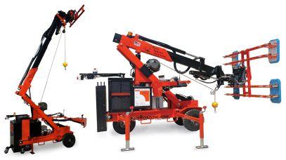 The GM 2000-16 with winch from Ergo Robotic Solutions has a maximum lifting capacity of 2,000 pounds and a maximum lift height of 16 feet. It can easily fit in a freight elevator and goes through a standard man door. It has an unladen weight of 3100 pounds without its 1400-pound counterbalance. The standard handling articulations include tilting the load left and right as well as up and down; shifting side to side;180 degrees rotation and the optional EZ Pick, an Ergo Robotic Solutions feature for picking and placing loads with one movement. When equipped with a