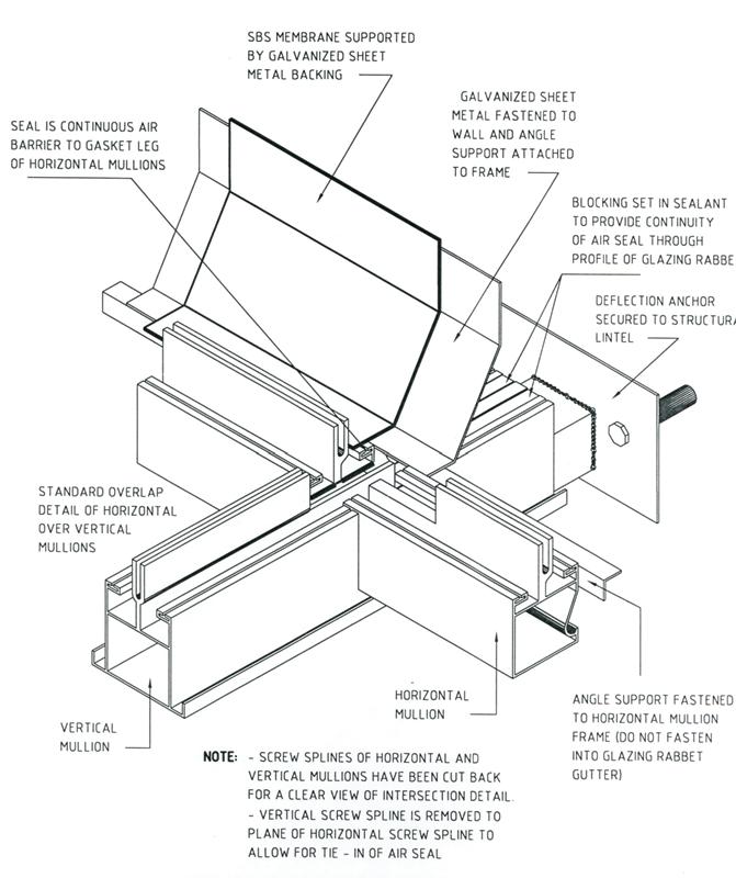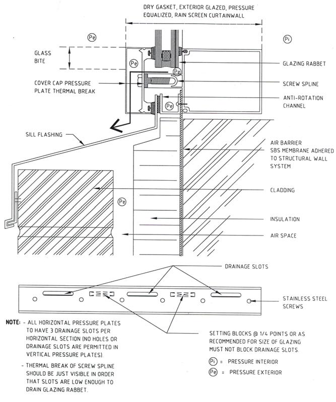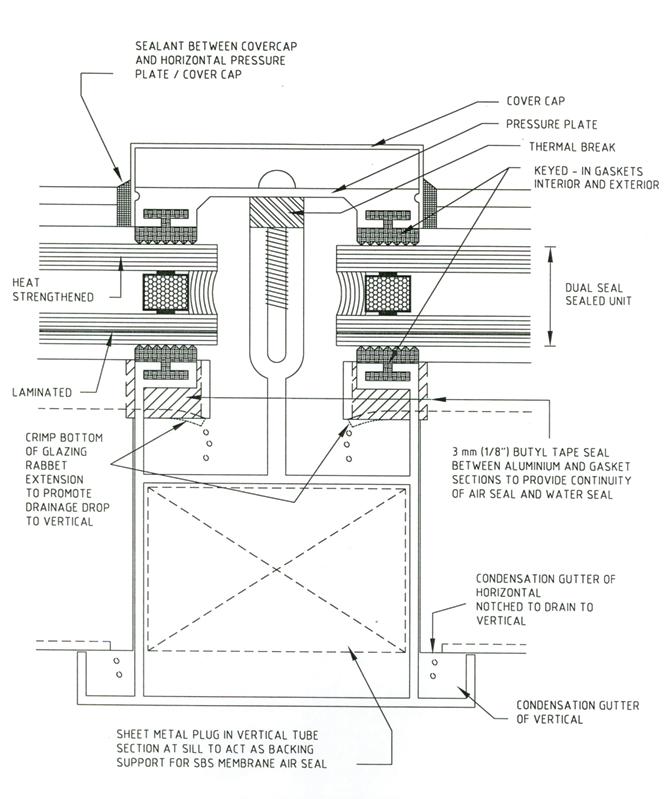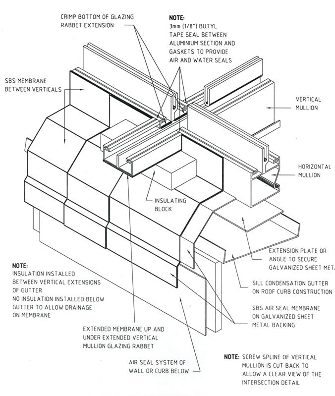 • In cold climates, a means of containing, collecting and disposing of condensation should be developed within the framing profiles to contain condensate water that might accumulate on inner aluminum and glass surfaces. This will depend on surface temperature, humidity and air movement. The use of add-on systems is usually an esthetically poor choice. The incorporation of condensate gutters as a safeguard against containment of water leakage through the glazing rabbet system is just poor design. The drainage of a condensate collection system must not be drained to the exterior, through the air barrier system, but should be drained from an evaporation trough at the sill or by mechanical drainage if a large amount of condensation is expected.