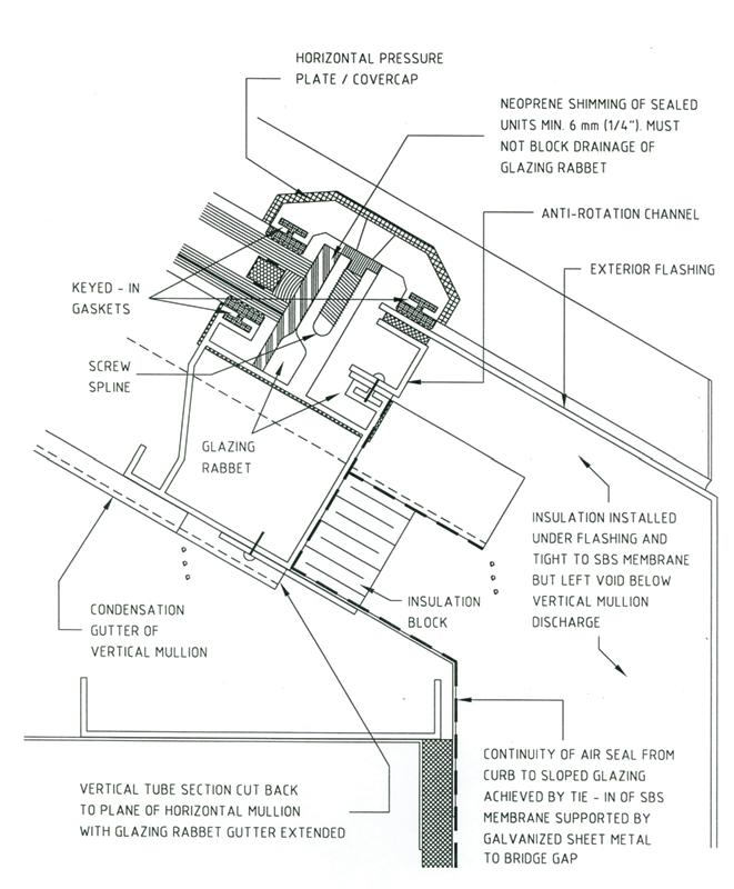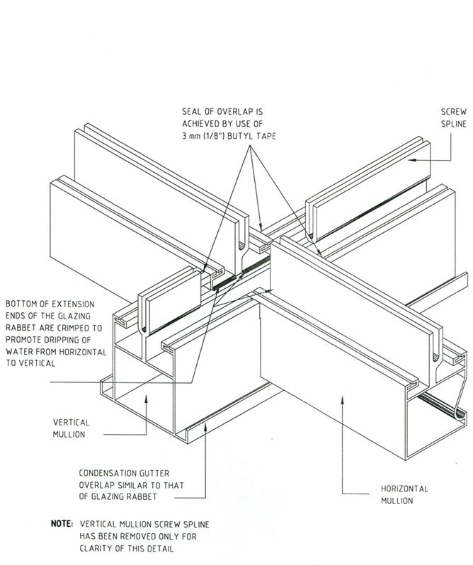 through the inevitable imperfections of the exterior seals, from rail to rafter members in a raised and shingled design. The design of the overlap should prevent water from flowing over the joint air and water seal of the aluminum system. The rafter glazing rabbet gutter must be designed to collect all of the water that could enter it and direct it in a similar raised and overlapped design at the sill. Joints that are subjected to constant or periodic wetting are prone to limited performance.