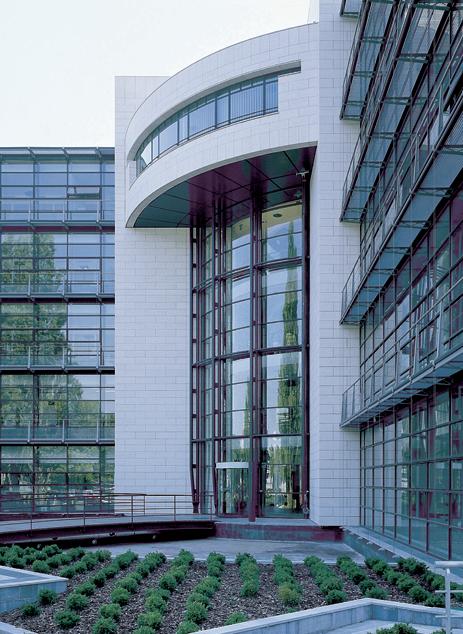 LEFT: The serpentine curtainwall has a positive convex curve in the east elevation and a negative concave curve in the west elevation which meet each other at the tangent and are harnessed to two separate glass and metal rotundas at each end.