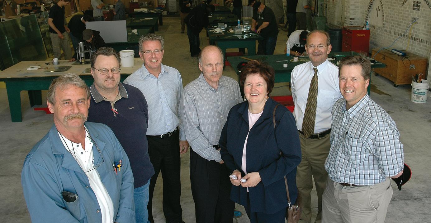 Partners in training and key players in getting the SAIT glazier apprenticeship program: From left, Ed Dalzell, instructor Glazier Program The School of Construction SAIT; Lynn Allan, Beacon Glass Products; Wayne Brandt , Kawneer Company Canada; Ross Wady, All Glass Parts & president of the GTA; Wendy Clarahan, Visionwall; Michael Czernick, AGC; Russell Bridgeman, PCL Construction Management.