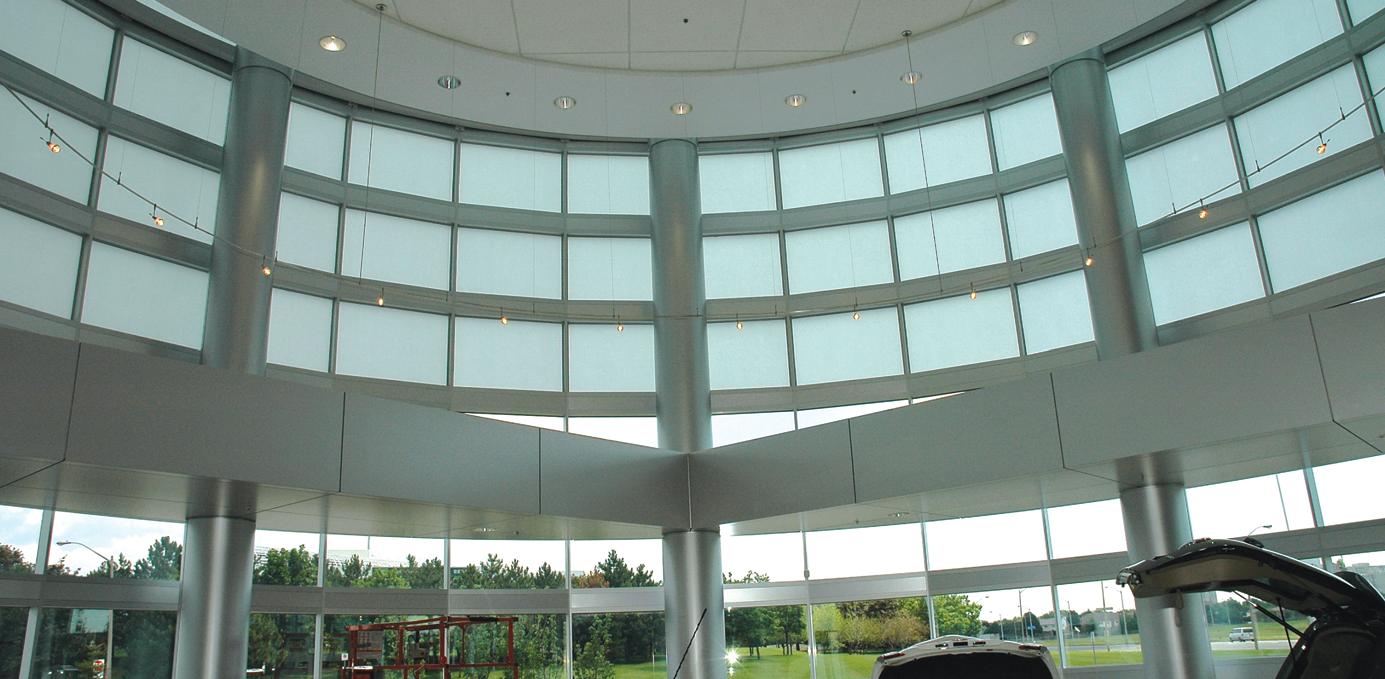Designed by R.H. Carter Inc. and glazed by Fairview Glass and Mirror Ltd., operated by Peter and John Kanellis, the building features two 34foot-high glass rotundas with splayed mullions anchoring a 220-foot-long serpentine curtainwall between them. In addition to the 500 IG units comprising 12,000 square feet of vision glass supplied by Ontario Float Glass (division of Triple Seal), the curtainwall also sports a unique glass product by Advanced Glazings in Sydney, N.S., called Solera T, that evenly diffuses the light in the showroom.