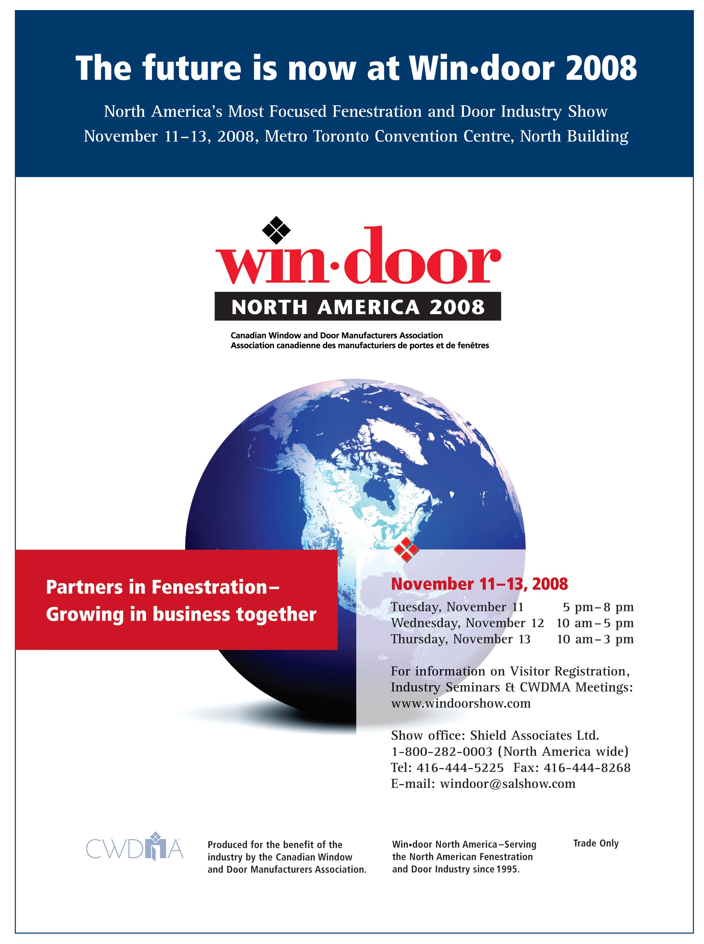 Which leads me to the sustainability of our replacement window industry. I have previously expressed the view that an industry set up to manufacture and install an individual building component is an anomaly. There are precedents of which the window industry is just one example, central heating also had its day. However you get to a point where the job is done and it is back to making building components for the heroes. Afriend of mine who works for a housing association, a privately owned provider of social housing, reckons the current problems faced by, mainly, the vinyl manufacturers are just a blip for the U.K.’s replacement window industry. Given the big pressure to reduce carbon emissions from buildings he reckons we will all be driven to replace our windows with more efficient versions. He is about to spend around $1.4 million of his $6 million building budget on upgrading the vinyl windows in the association’s estate. He reckons everyone will need to do the same over the next few years. Mind you, he replaced all of the windows in his own house four years ago – with hardwood. ■