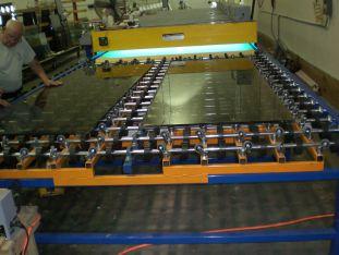 Three key benefits are cost of equipment, cost of production and no need for a clean room. Process components include a taping table where the operator prepares a piece of glass, sealing off the edges of glass. At the tilting assembly table the operators apply a second layer of glass, combining two pieces of glass with a gap between. On the filling table, operators fill the gap between the glass with liquid resin. Next the piece moves to the UV curing oven where ultraviolet light cures the resin between the glass. This bonds the liquid to the glass.
