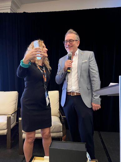 LEFT: At the Halifax Spring Conference, Jennifer Small (Screenco) and Fenestration Canada president, Ron Edger (Centennial Windows), presented the President’s Award for outstanding volunteer participation to Jayme Tilley of Screenco… over the phone. Tilley was unable to make it to the conference in person.