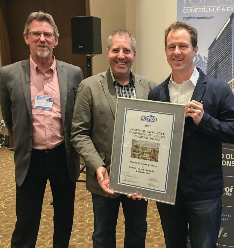 ABOVE: It’s a chance to get recognized for the great work you and your team have done. Here, OGMA directors Steve Gusterson and Angelo Cairo present the award for design to Gary Watson of Diamond Schmitt Architects at Top Glass 2017.
