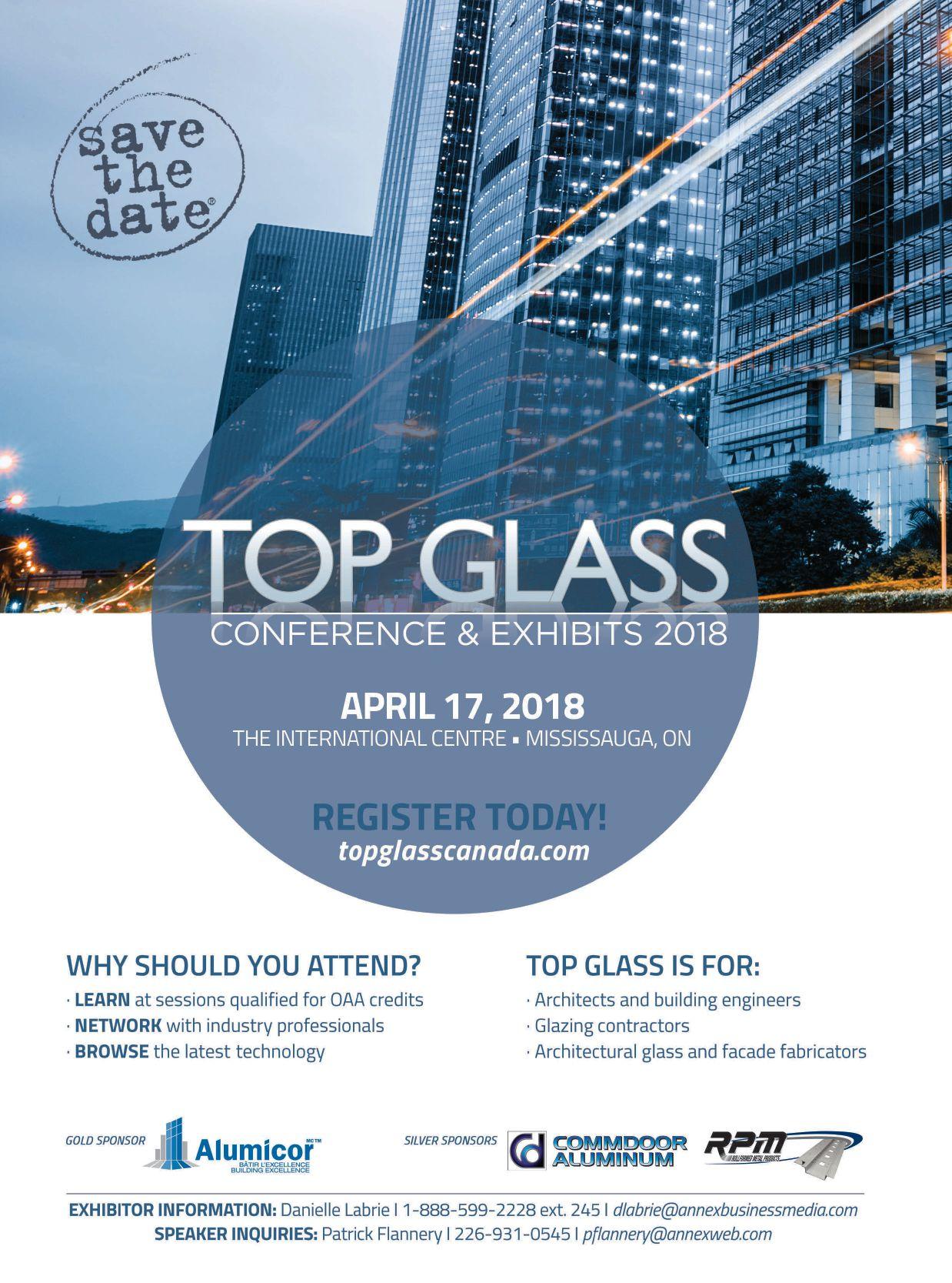 Top Glass returns to the International Centre in Mississauga, Ont., on April 17 and you can check out our incredible lineup of educational speakers at topglasscanada.com. There’s something for architects, contractors and fabricators alike. All sessions qualify for OAA Structured