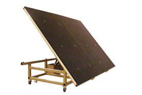 The CRL 2402498 cutting table is constructed of heavy-gauge steel, electrically welded and painted. The table combines a popular counter-balanced tilt top mechanism with a 12-port air flotation system to provide easy loading and movement of glass sheets. Smaller than standard tables, this six-by-eight-foot table is easily portable and provides a very small footprint when standing upright. The 2402498 air float system runs off 110-volt, 60-hertz single phase power. The table is shipped with a full smooth 3/4-inch particle board top, carpet and adhesive. Assembly required.