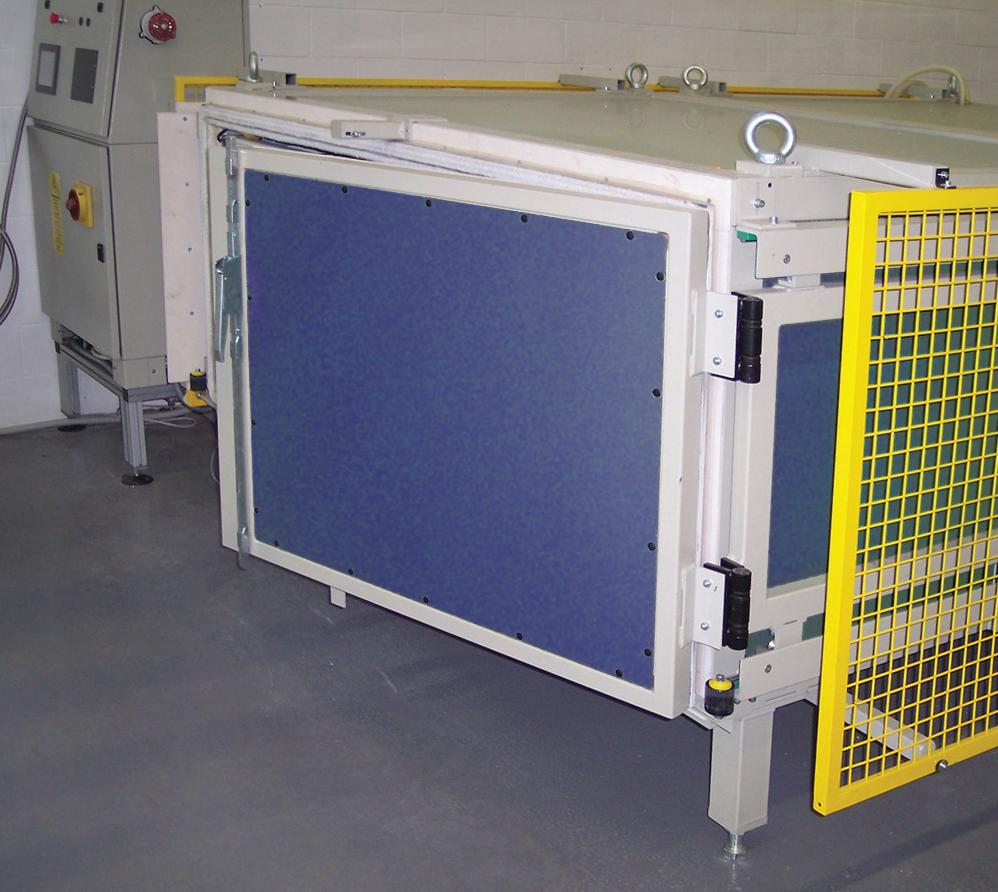 flow meter, pressure gauge, inner oven walls sealing directly against a 1⁄2in thick silicone rubber door seal, air jacket on the inner oven for cooling, blower shaft seal, outlet with pressure relief, interior seams welded gas-tight and all wall penetrations equipped with compression fittings.