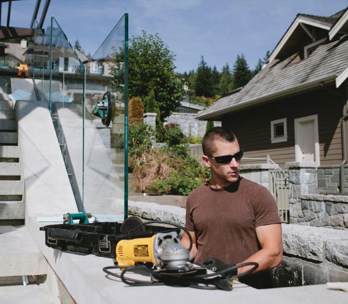 ment, Optimum keeps its panels as large as possible and the hardware and structural work to a minimum. Wilson’s team strives for a symmetrical look that follows the lines of the building without adding elements. Cooke landed in Vancouver five years ago with a checkerboard background of business school, training as a plumber and experience working in and managing a railing fabricator. He met Wilson when he got a job plumbing his bathroom. Wilson must have seen something in Cooke that set him apart from the average plumber, because it was not long after that when he hired him to manage Optimum’s four employees. The move was apparently a good one, because the company has grown since then to 14