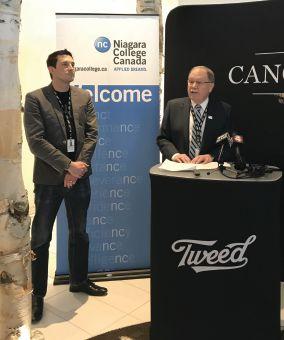 Canopy Growth president Mark Zekulin (left) and Niagara College president Dan Patterson announcing a new education partnership that will open up co-op placements and internships at Canopy’s Tweed Farms for students in the college’s horticulture and commercial cannabis production programs.