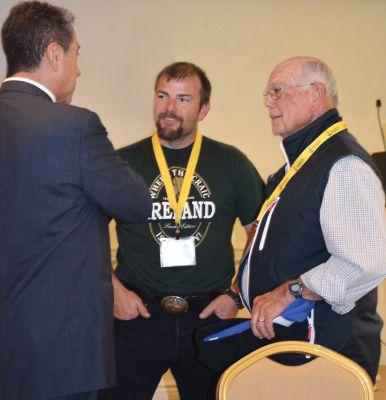 The OGWA’s Anne Gammage (left) congratulates Mary Jane Conboy and Dan McLean on their Earth, Wind, Fire, Water award for outstanding contributions to the ground water industry, including their implementation of the Well Wise program.