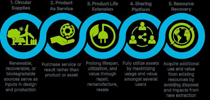 The meaning of circular economy is one which reduces material use, redesigns materials to be less resource intensive, and recaptures post-consumer waste as a resource to manufacture new materials and products. There are five circular models that underpin the circular economy that are based on the principles of longevity, reuse, repairability, upgrade, share, and material reduction and recovery.