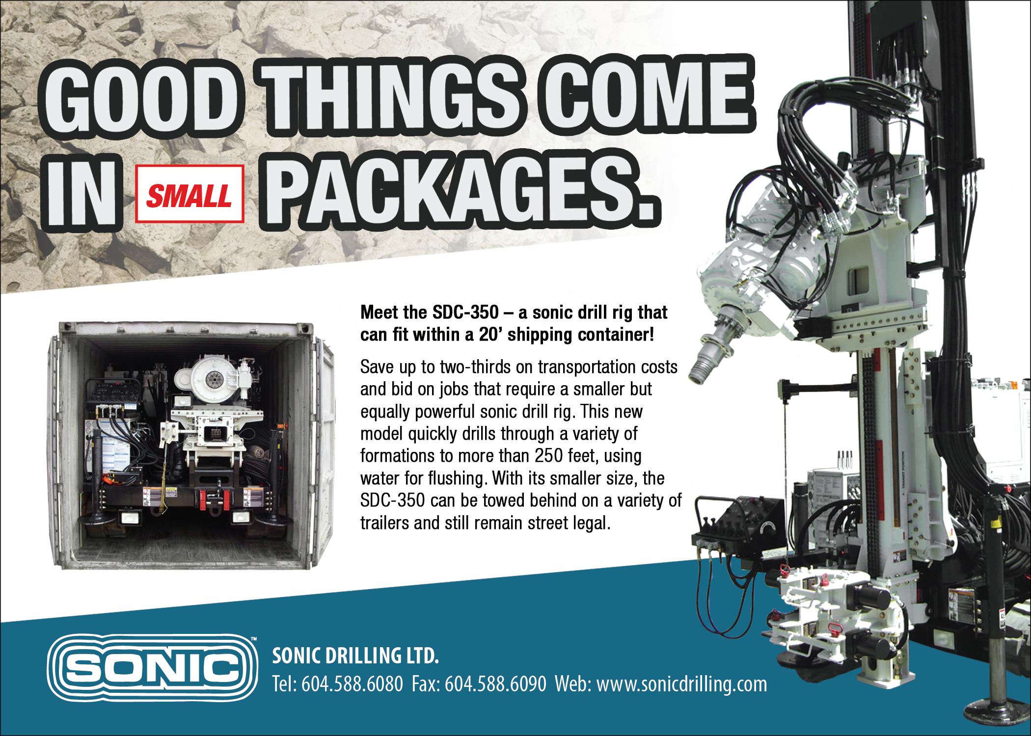 Using award-winning, patented technology developed by the Sonic Drill Corporation (SDC), sonic drilling offers the world’s most advanced drill method and, now, with mounted tracks, you can take it anywhere. Discover how a sonic rig can drill three to five times faster (depending on soil conditions) while coring easily through overburden material to 300 feet and beyond. It’s the ideal choice for geothermal, environmental and mineral applications. Explore the SDC-350 crawler rig, with its powerful drill head but smaller, manoeuvrable size (able to fit inside a 20-foot shipping container), which is great for tight urban projects where space is limited. Visit www.sonic-drill.com, www. sonicdrilling.com or www.sonicgeothermal. com, or call 1-877-854-1383.