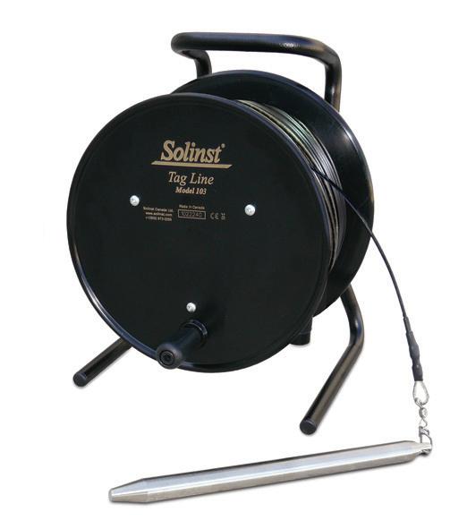 the Solinst Tag Line provides a simple method to measure the depth of a backfill sand or bentonite layer during the completion of a well, and to measure depth to the bottom of a well. The Tag Line uses a weight attached to a durable polyethylene-coated stainless steel wireline, in lengths up to 1,000 feet (300 metres) mounted on a sturdy freestanding reel.