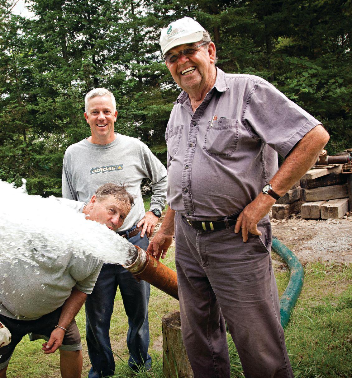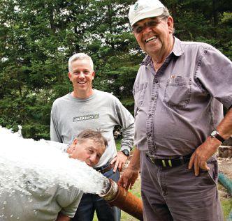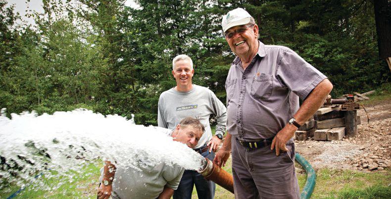 Bruce Hietkamp of Geo Kamp Ltd. stands smiling in the background, Roger Boadway of Roger Boadway Enterprises Ltd. in Sutton, Ont., grins in the foreground and driller Phil Brown takes a drink during 2,000 litres-perminute pump testing of a fish hatchery well near Mount Albert, Ont.