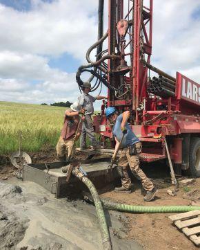 Roger Boadway remembers that the material was wet from five feet down to about 150 feet. “Getting 8-5/8-inch casing down the hole was hard,” he says. “We had to hold the ground up around the casing so we could pour the Quik-Gel fluid, which is double the weight of water.” They had to drill