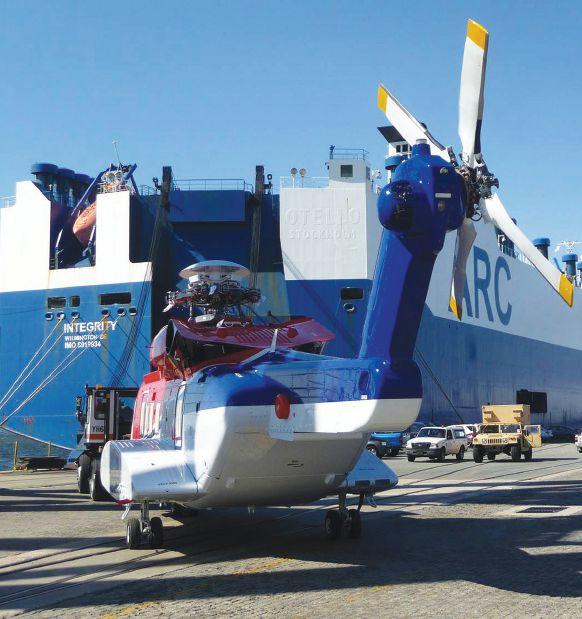 ABOVE: An S-92 about to embark on a trip to Europe on a Roll On, Roll Off (RORO) ship. (Photo courtesy of Panalpina Inc.)