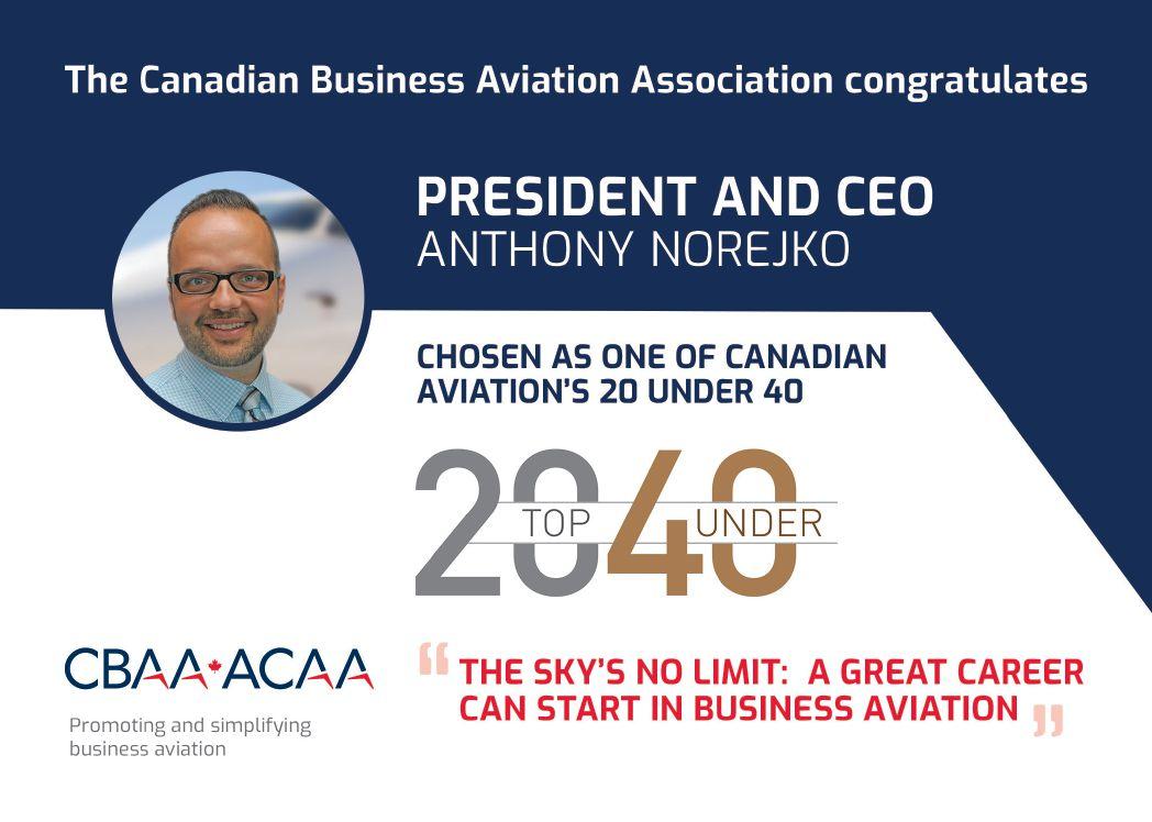 President and CEO, Canadian Business Aviation Association, Ottawa, ON Anthony Norejko, age 39, took on the leadership of the Canadian Business Aviation Association (CBAA) in August 2018, four years after he joined the organization’s board, when he focused on strengthening membership, which currently includes some 400 members located across the country. He also played a pivotal role in working with the Greater Toronto Airport Authority (GTAA) on slot restrictions, helping to establish the CBAA/GTAA Technical Working Group.