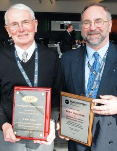 Agar Stringer award winner Al Eustis (left) and Universal Helicopters president/COO Geoff Goodyear, showcase their hardware. Goodyear was the recipient of Eurocopter Canada’s inaugural “Innovation in Safety” award.