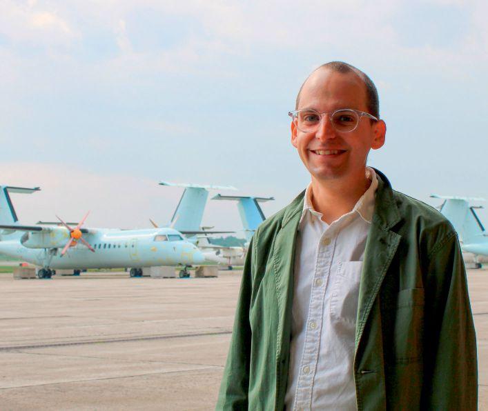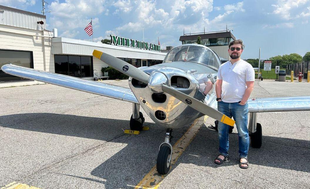 Adam Strombergsson-Denora of Ottawa standing in front of his 1946 Piper Ercoupe at Buttonville Airport.
