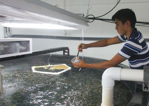 Water from the 1,000-liter culture tank is recirculated through an attached biofilter. Good water quality is maintained by removing organic waste using a mechanical filter, a foam fractionator and a biofilter to detoxify ammonia.