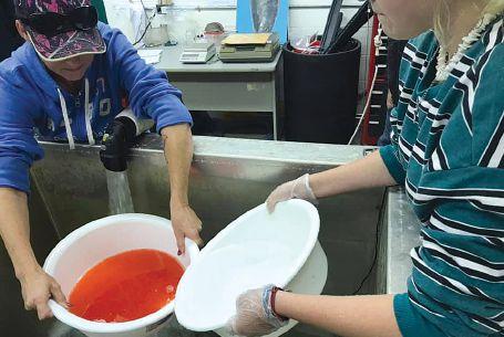 Salmon milt in straw samples Volunteers rinsing off excess milt