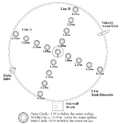 sampling of tank currents was carried out for all combinations of the following: ~30% of the main flow as velocity assist flow (1136 lpm), ~50% of the main flow as velocity assist flow (2271 lpm), ~60% of the main flow as velocity assist flow (2763 lpm) and low (0.14 bar), medium (0.33 bar), high (0.56 bar) velocity assist inlet nozzle headloss. Water flow was adjusted by changing the number of pumps operating and adjusting a control valve. Nozzle headloss was adjusted by changing the number of 2.54 cm openings on the inlet.