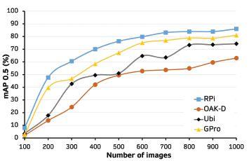 Since the ambient model was trained with a relatively complex dataset and had sufficient data to learn, it performed well on a test dataset captured in similar light conditions. We also learned that sensor selection substantially affected the model performance. In both light conditions, mAP and F1 score for the RPi model was considerably higher than GPro, OAK-D and Ubi models (Figure 2). Additionally, OAK-D and Ubi models had a lower whole-to-partial mAP ratio compared to RPi and GPro.