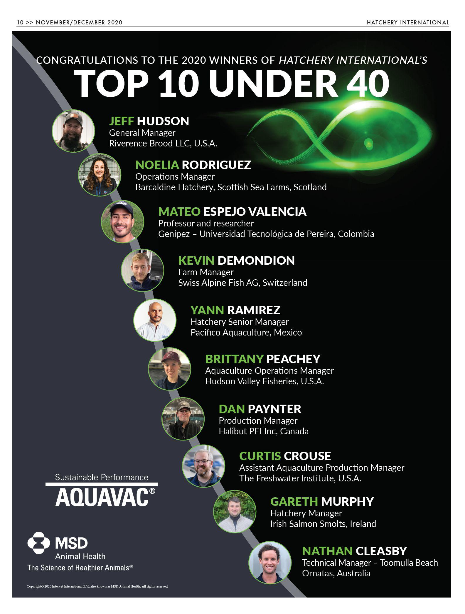 rom the Atlantic to the Pacific, this year’s roster of some of the world’s most exceptional hatchery practitioners under the age of 40 are as diverse as the species they work with. Ten talented professionals from around the world coming from different backgrounds – research, academia, production, business management – continue to provide confidence that the future of the industry is bright.