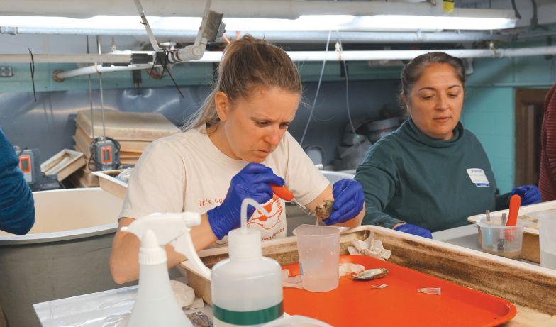 Elizabeth Martin, a graduate student in the marine biology program at COLSA is studying IMTA systems that pair farmed shrimp with water-filtering species, like oysters, to determine if the grouping will cut down on the amount of ammonia and phosphorus that remains in the water as part of the farming process.