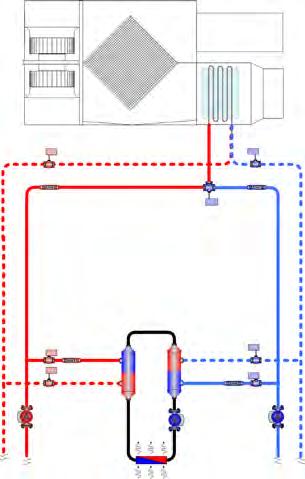 ume hot water plant fed by two 6.0 Mbtuh natural gas boilers. This hot water is supplied at 40C and 60 to 70C to two systems of the mall, the old and new malls, respectively (the mall was built in 1979 and expanded in 2001). Since the old mall runs at 40C, it previously ran on a heat exchanger to keep the temperatures lower. The new heat recovery chiller project re-piped the heating supply system to run in series. This way, the water at 60 to 70C goes to the loads of the new mall first and the cooler return water is then mixed as needed and supplied to the 40C old mall.