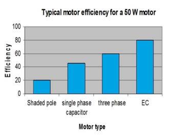 The chart on the previous page (Figure 1) illustrates the differences in efficiency between the common motors used in refrigeration evaporators: shaded pole, single phase capacitor (SPC), three phase and EC.