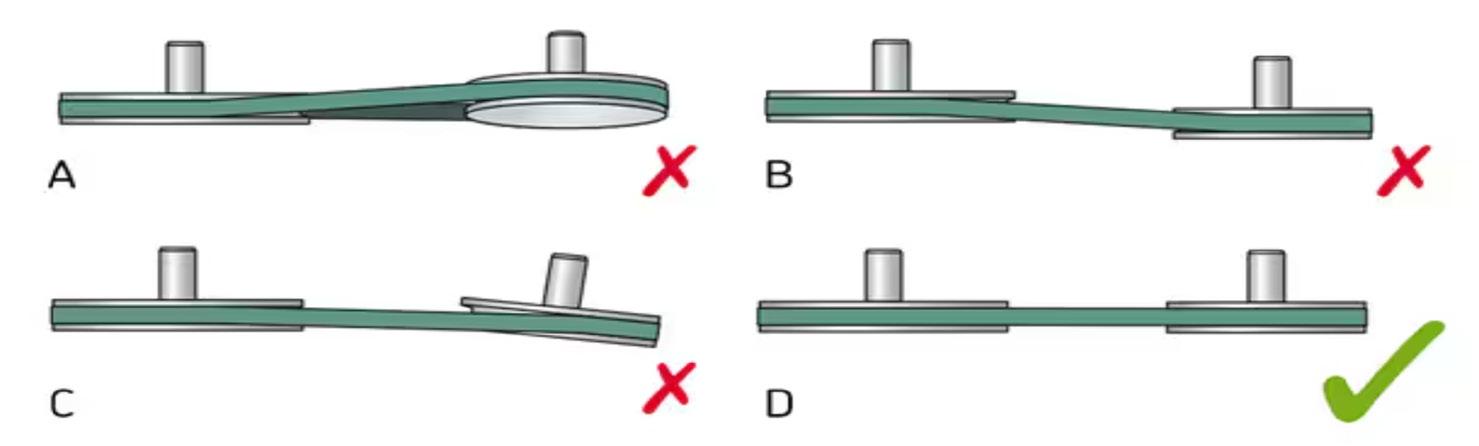 3.) Proper pulley alignment is also key to belt life. The use of a straight edge (or piece of string) can assist in the proper alignment of the pulleys. In addition, various pulley alignment tools are available. See Figure 2, where A illustrates pulleys being out of alignment angularly vertically; B illustrates pulleys being out of alignment parallel horizontally; C illustrates a pulley being out of alignment angularly horizontally; and D illustrates two properly aligned pulleys.