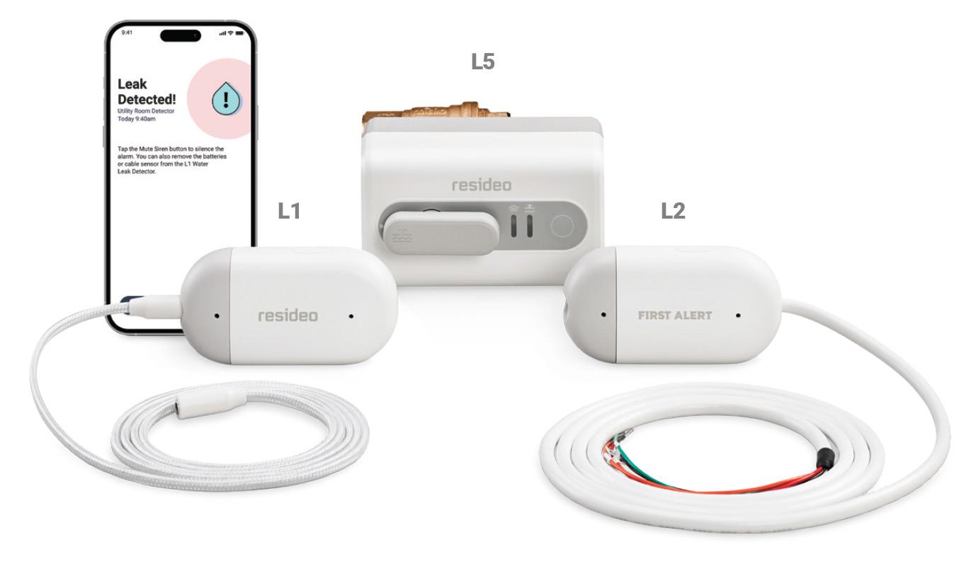 The L1 WiFi Water Leak and Freeze Detector alerts customers to water leaks, temperature drops and humidity spikes. Pair with the L5 Water Leak Shutoff Valve to shut off the home’s water supply when it detects water via the sensor cable or with the L1 device. For additional home coverage, combat against water damage from condensate overflow with the L2 WiFi Water Sensor and Switch.