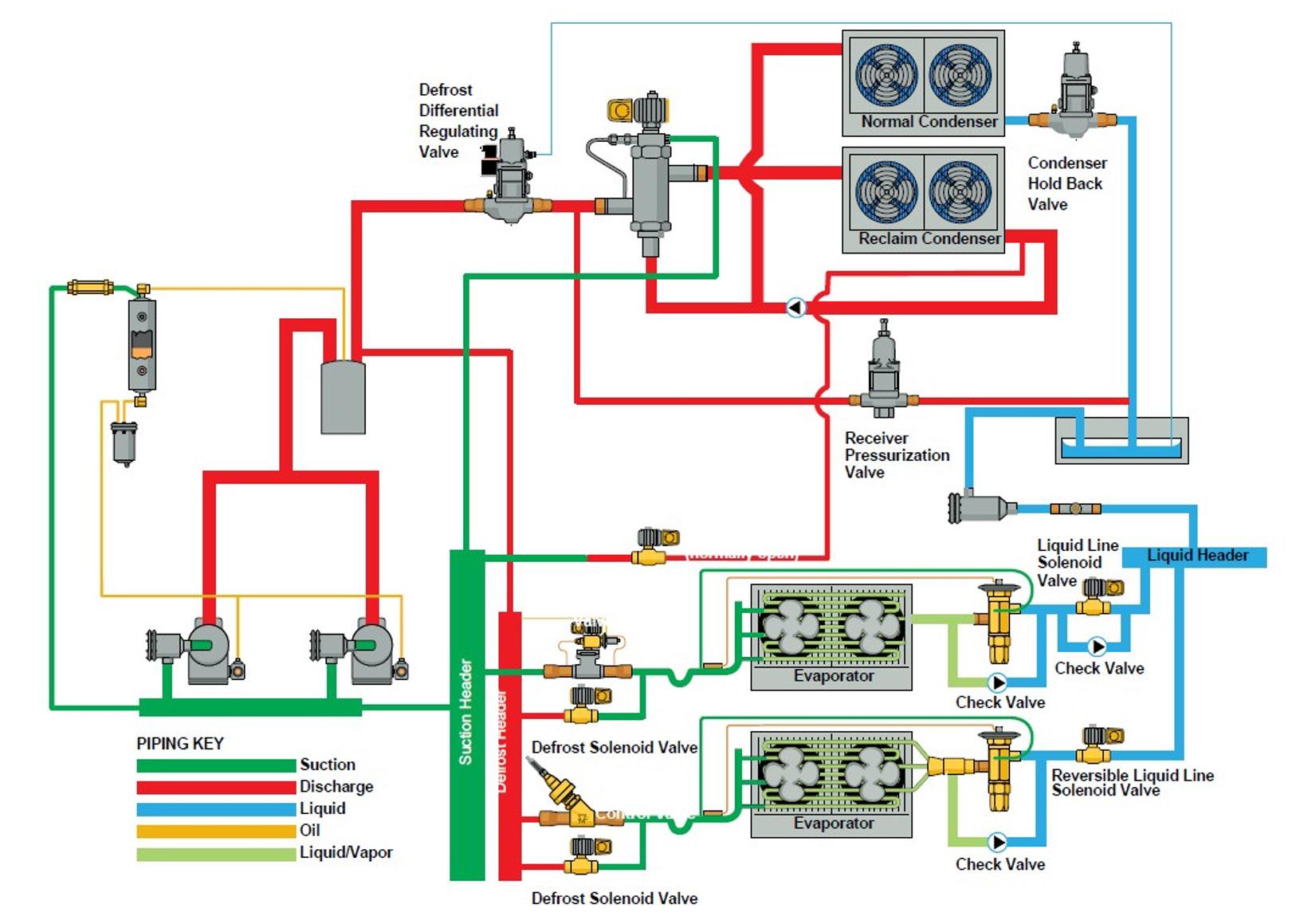 Here is the potential problem: the liquid differential valve is sized to handle the full capacity of refrigerant liquid mass flow at the design condition. During periods when a given system is in the defrost mode, the mass flow through the main liquid line will be reduced in three ways: (1) any system still in the refrigeration mode at conditions less than design load will reduce the demand for liquid mass flow; (2) the system in defrost will have no liquid refrigerant mass flow requirement, and
