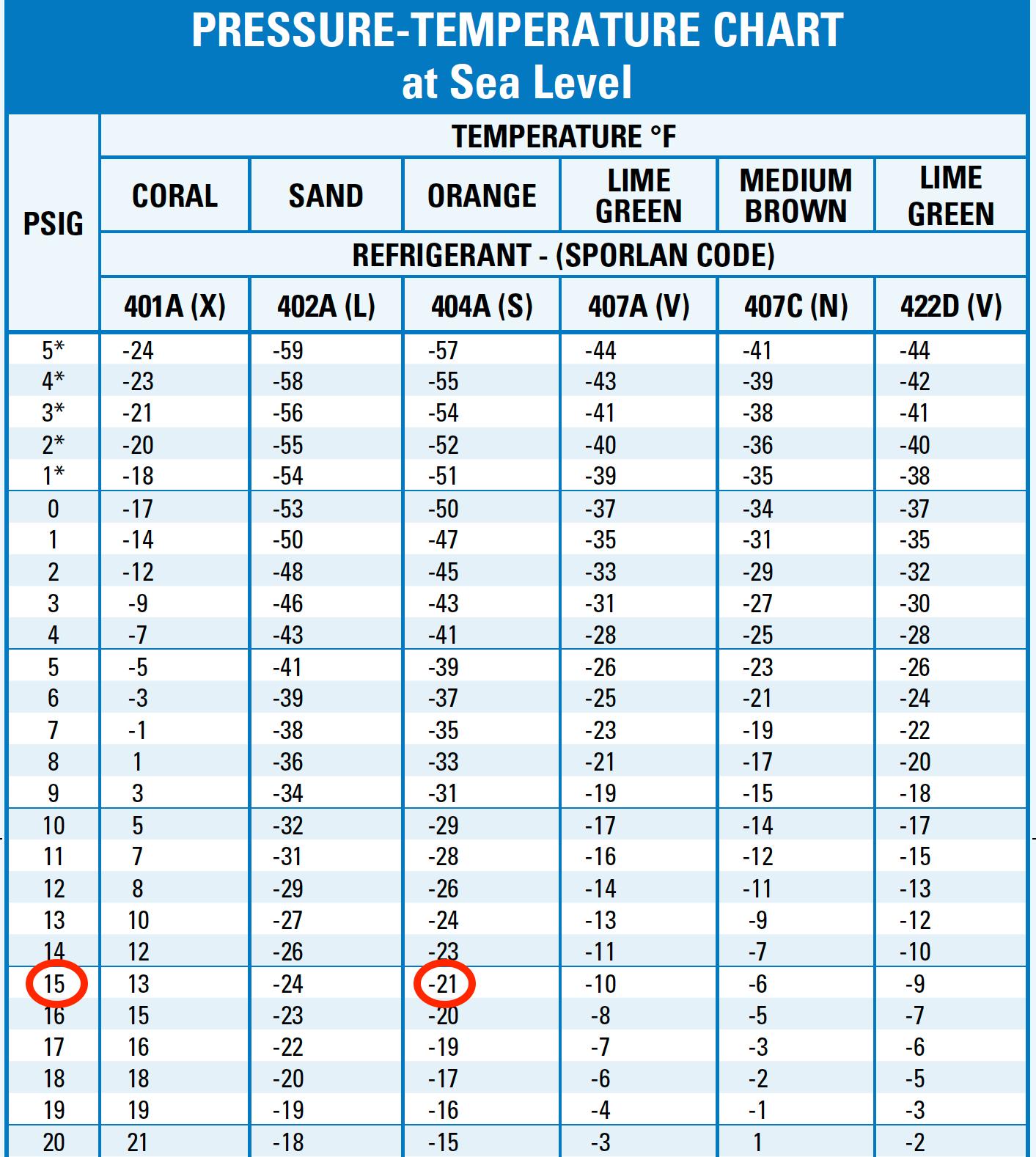 Figure 3 shows a snippet of a common Pressure-Temperature (PT) chart. The two red circles indicate that at a pressure of 15 PSIG, the saturation temperature of R-404A is -21F. Instead of looking up numbers on a chart, there are many
