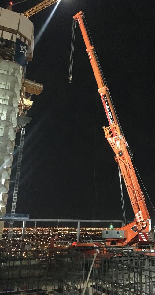 Steel Giraffe drove the AC 45 City approximately 6 mi (9.7 km) to the project site and arrived by 9 p.m. The crew had the crane rigged and hook-ready to by 10 p.m. Kelly appreciated the ability to drive and operate the crane from the same cab without needing to exit.