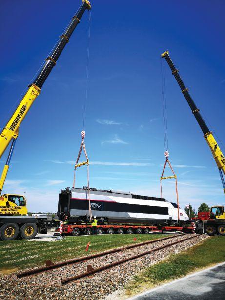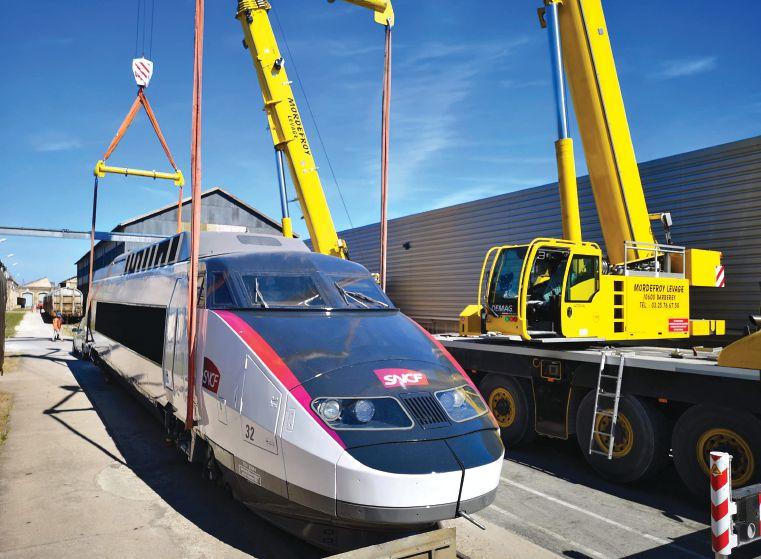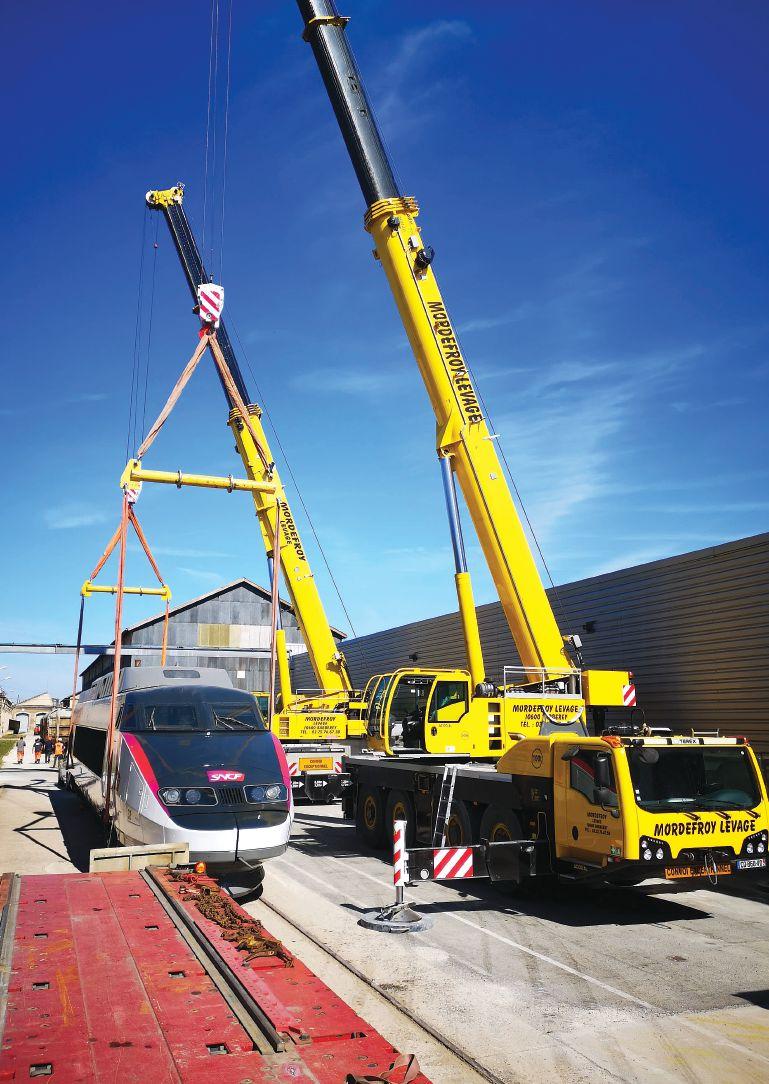 Crane service provider Mordefroy Levage used its triedand-true Demag AC 100-4L and AC 140 duo from its fleet to move a 34-tonne TGV locomotive onto a track at the Technicentre SNCF in Romilly-sur-Seine.