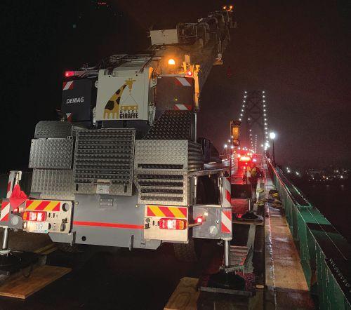 Steel Giraffe quoted the project using its AC 45 City crane positioned on the bridge deck to lower materials more than 100 ft (30.5 m) to the work platform below. The first challenge was to ensure the deck could hold the weight of the crane with load. “The planning software was helpful in determining the weight, radius and outrigger setting to provide printed proof the bridge deck had the capacity,” he adds. “Both Empire Crane and Demag worked with us to help prepare the plan.”