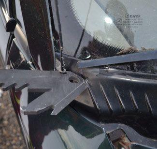 What about removing the windshield? The edge of the tool is also a glass cutter that will produce large chunks rather than fine powder, which will simply drop down rather create a fine glass powder that will float around in the air (see photo 13); the teeth can be sharpened with a round and flat file if they become dull from many windshield removals. Lastly, the claw end can be used to remove the socket end of lift struts that hold up trunk or hatch lids.