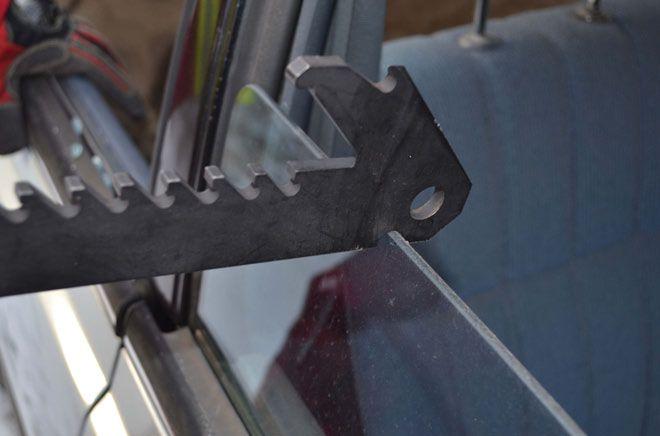 Photo 10: The tool also has a small hook-like feature for removing the rubber weather seal gaskets around the vehicle body. It is sometimes helpful to remove this seal so that you can see a clear path for your cut.