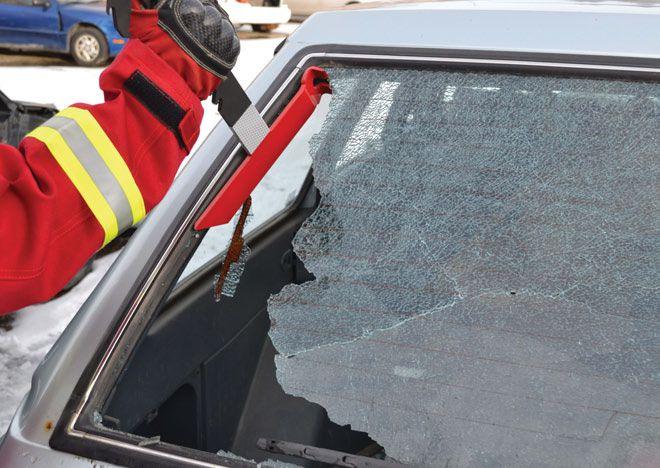 The next step is to gain access to the patient for medical assessment: try before you pry is a must but if no doors or windows open then they must be breached. The same pointed end of the Tomahawk can make short work of the side glass; choose a spot as far away as possible from the patient then give the window a tap and it should shatter (see photo 6). Note: if possible, use Packexe first to control the glass; see the August 2011 issue of Fire Fighting in Canada for more information on Packexe). Use the outer edge of the tool to clean out the remaining