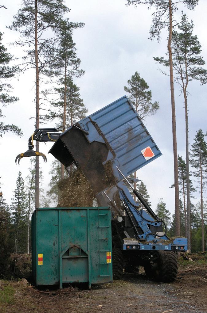 using a Log Max 4000 harvesting head on an Eco Log harvester. The roundwood was cut to length and sorted into pulpwood and energy wood for trucking to end-users, leaving the tops and branches to be collected and processed using methods such as chipping, bundling, or forwarding. In this case, a Ponsse 14-tonne forwarder with variable load space was collecting and transporting slash to small piles, to be covered by waterproof paper for six to nine months for drying. A Bruks mobile chipper completed the process, moving to the slash piles, chipping, and transporting the chips to a larger container at roadside, ready for delivery to a heat or CHP plant.•