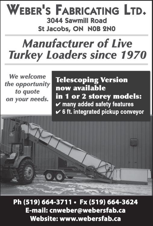 WEBER’S FABRICATING LTD. - Weber’s Fabricating is a family owned business, which started manufacturing Live Turkey Loaders in 1970. Clare grew up on a turkey farm and he has first hand knowledge of the turkey business. Today we offer the traditional slider model as well as a telescoping model in either a single or 2 storey. We are a custom job shop and can probably build it if you can think of it. We would be pleased to quote on your needs. Contact us at (519) 664-3711 or email cnweber@webersfab.ca